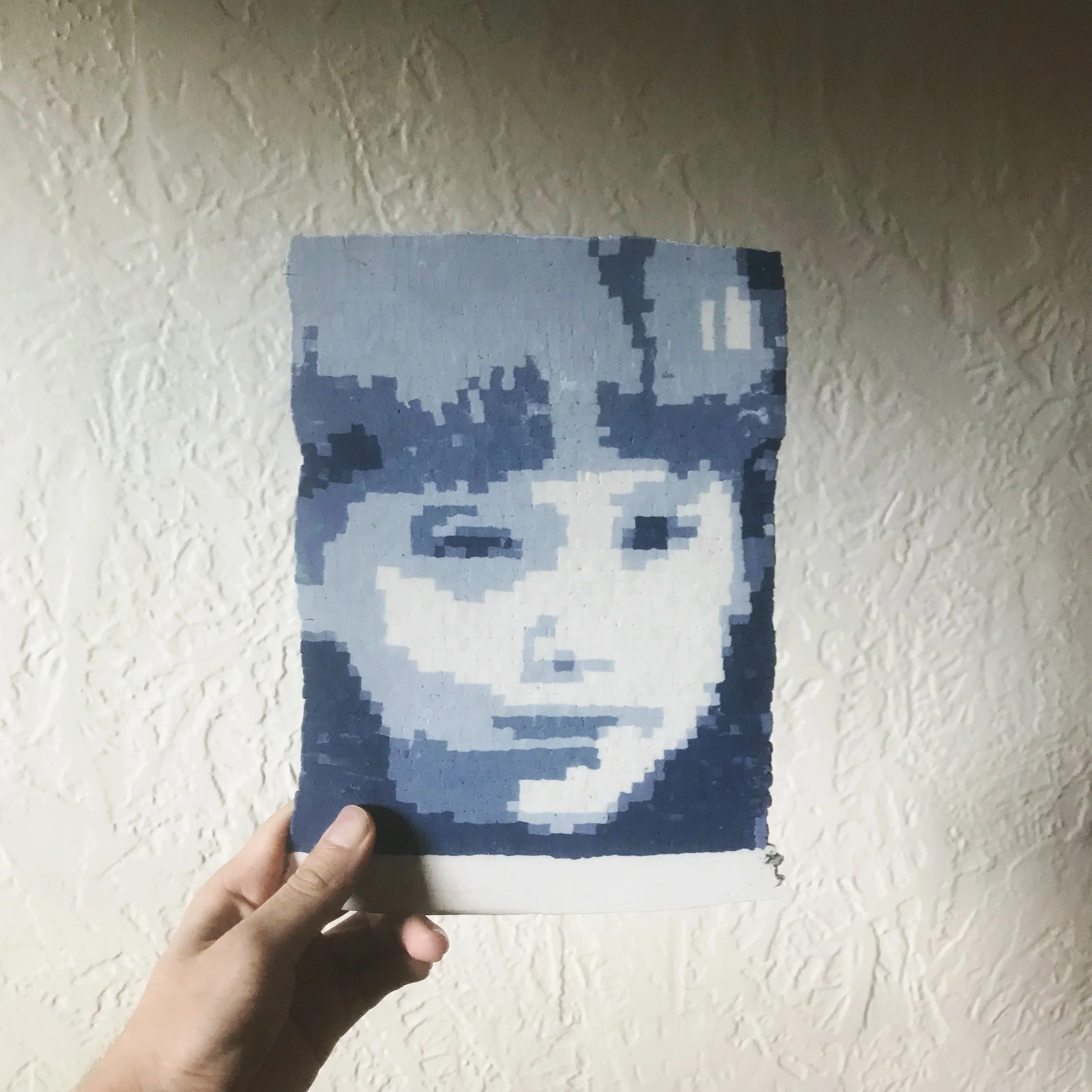 In 2018 I was invited to an exhibition called Queer Craft. I had used a clunky program to create a fictional child, named Billie, using photos of myself and my husband, wondering what a biological child would look like from a same-sex couple. The finished work was a low-resolution 2D blue-and-white image in porcelain.