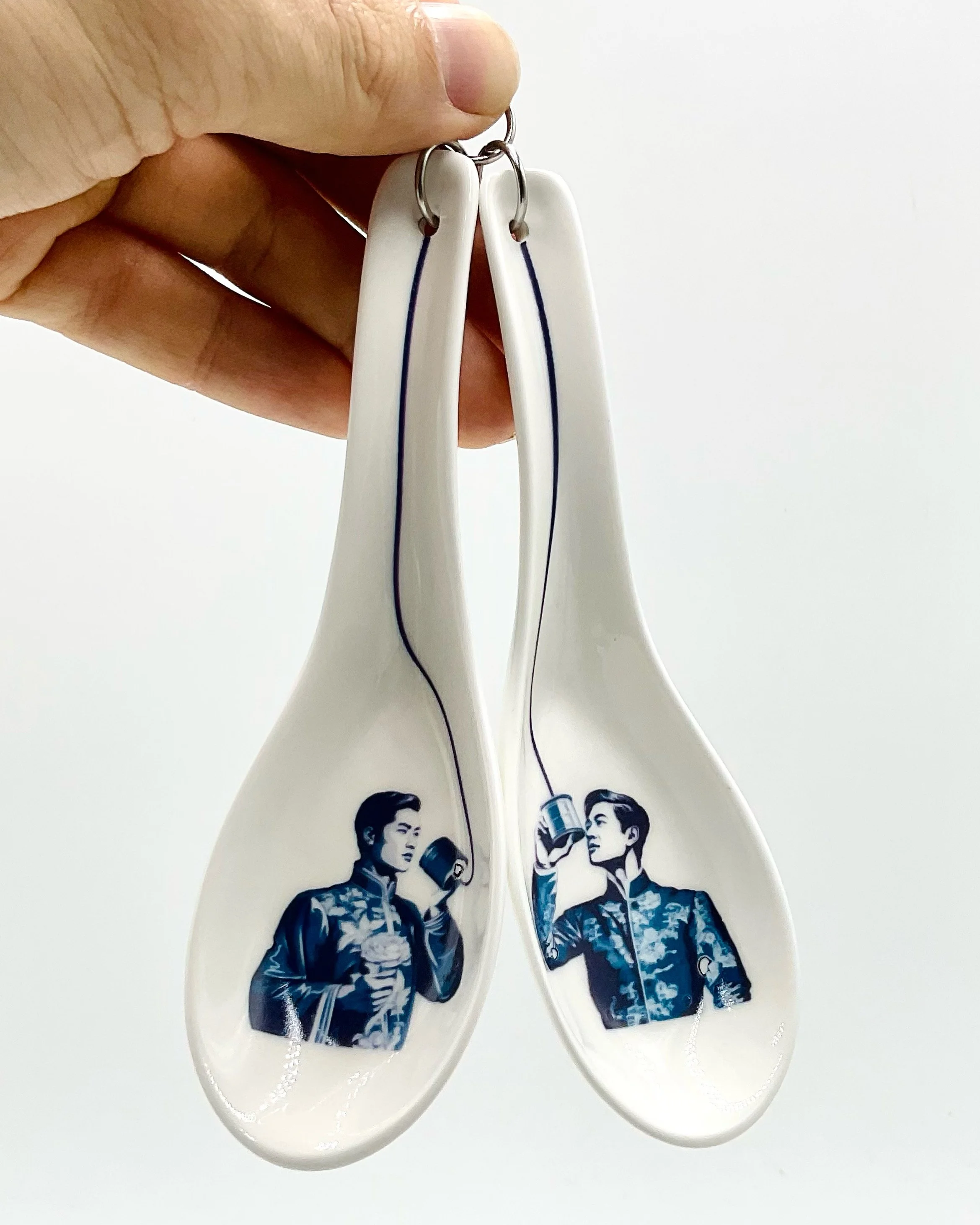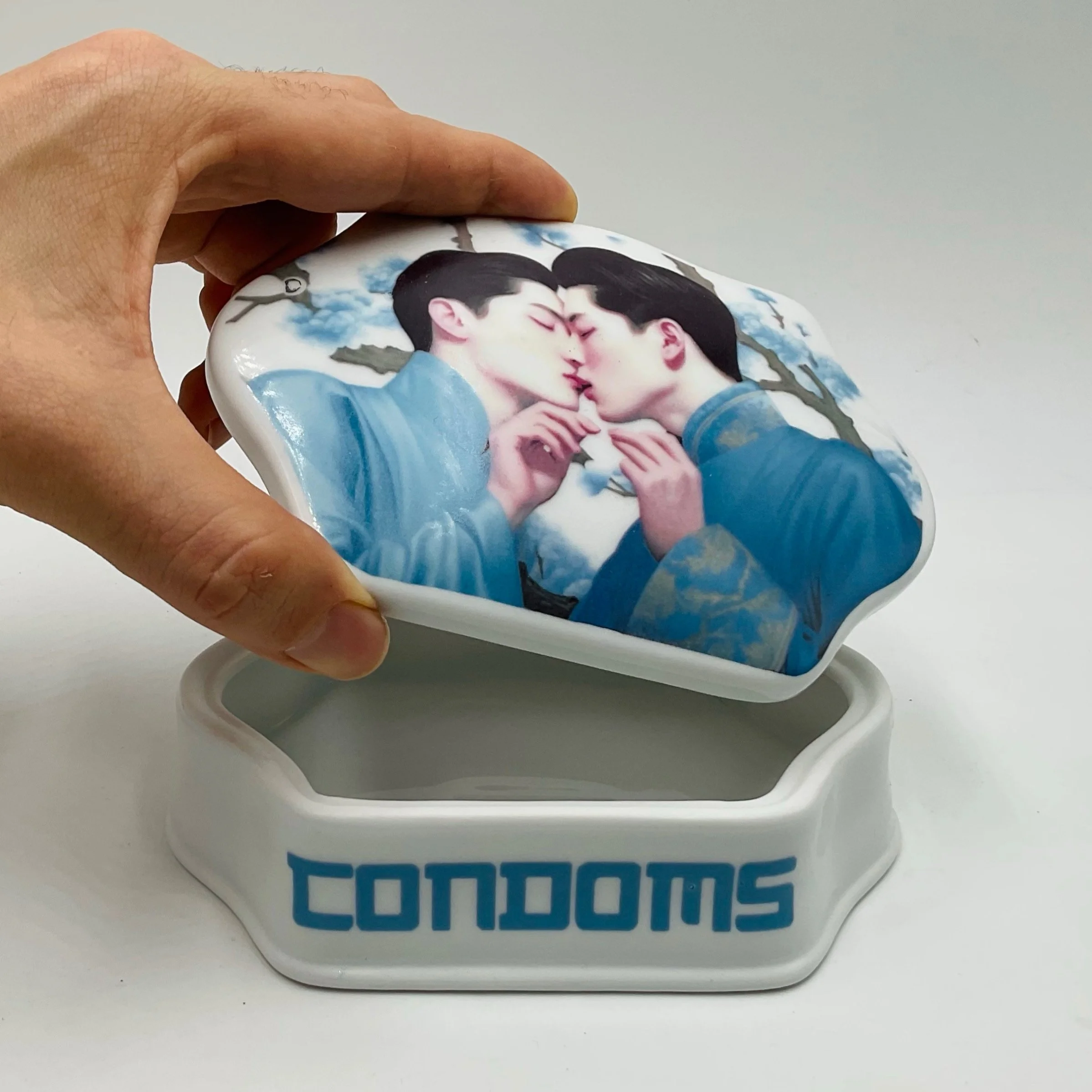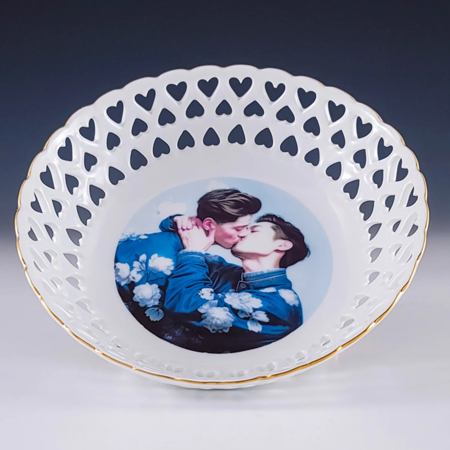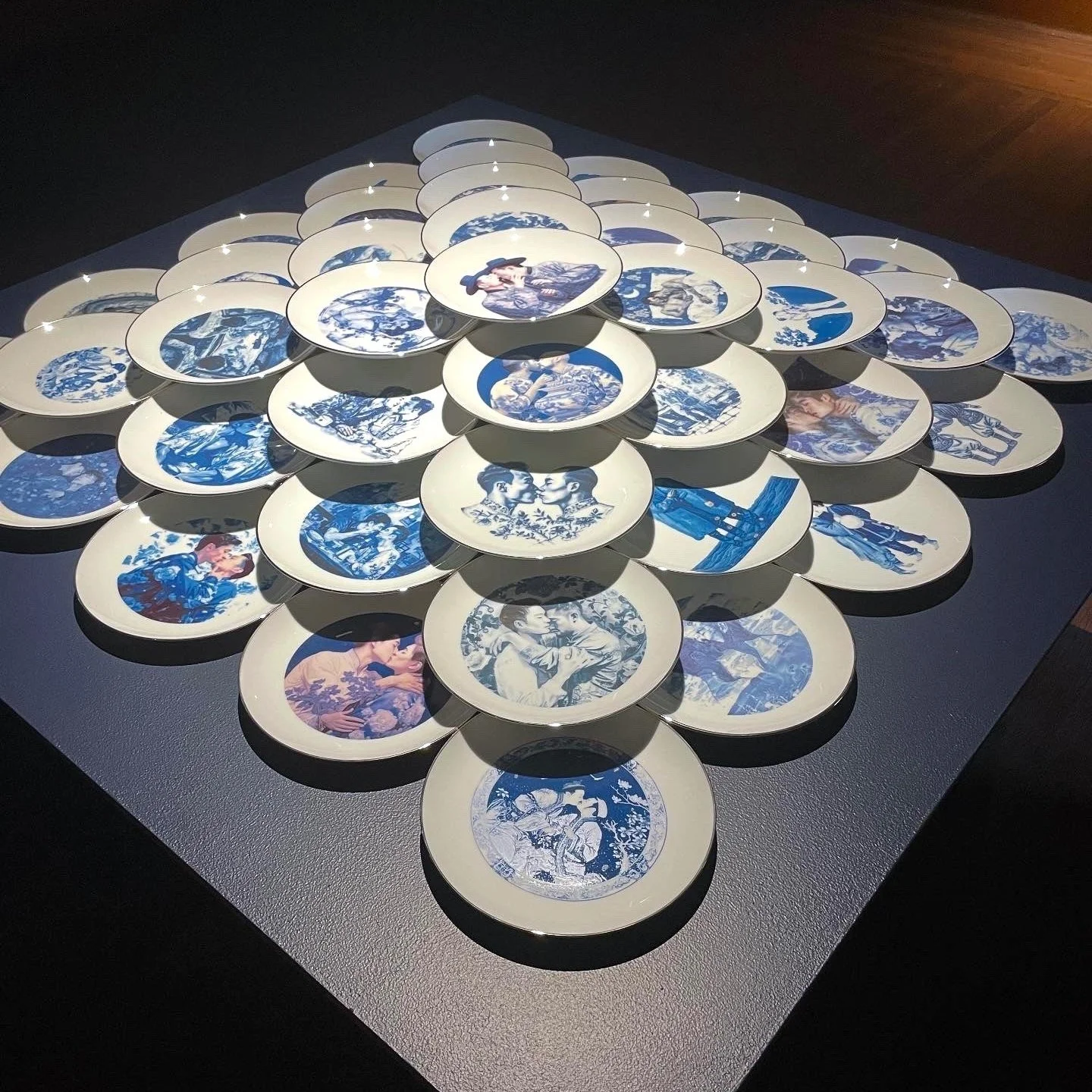 “/imagine” is the prompt used to start an Artificially Intelligent program to create an image. Inspired by alternate fiction (also called counterfactualism), I wondered what the globalized world would have looked like without homophobia and what our objects would look like if it had celebrated gay culture. These plates are generated by AI to fictionalize historic blue-and-white Chinese pottery to celebrate gay male romance. No image is repeated twice, and an open-edition series.