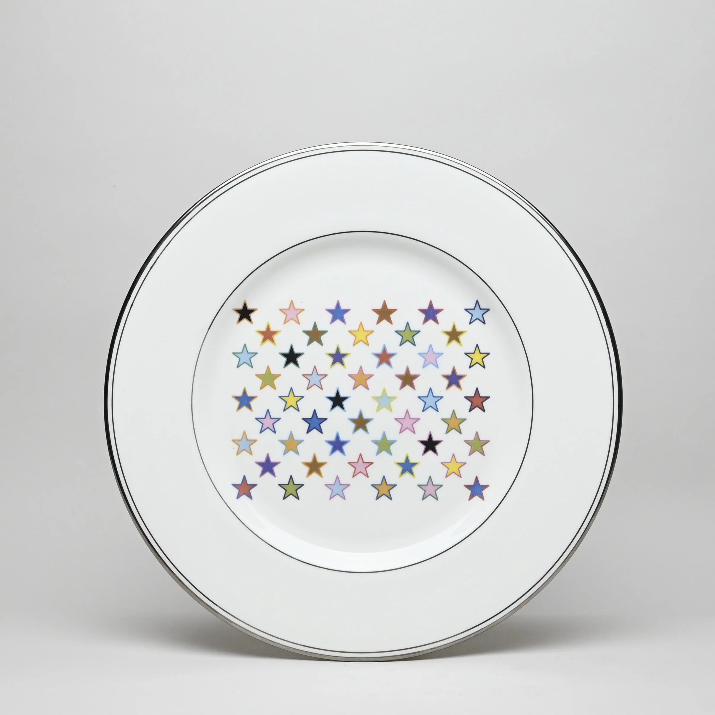Using a Lenox Federal Platinum dinner plate, I tasked myself to create dinnerware fit for a queer president. I created a design that mimics the pattern of stars on the American Flag. Each star has two colors: the inside color way represents the contemporary Progress Flag, while the outlined color features a color from the original Pride Flag.
