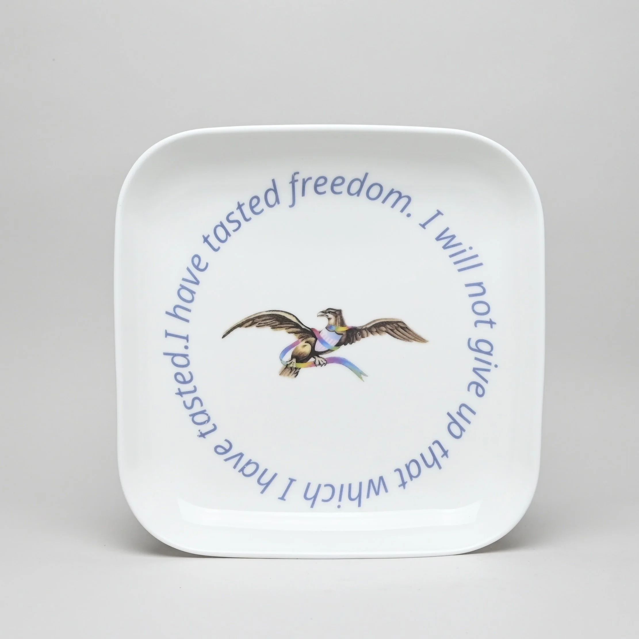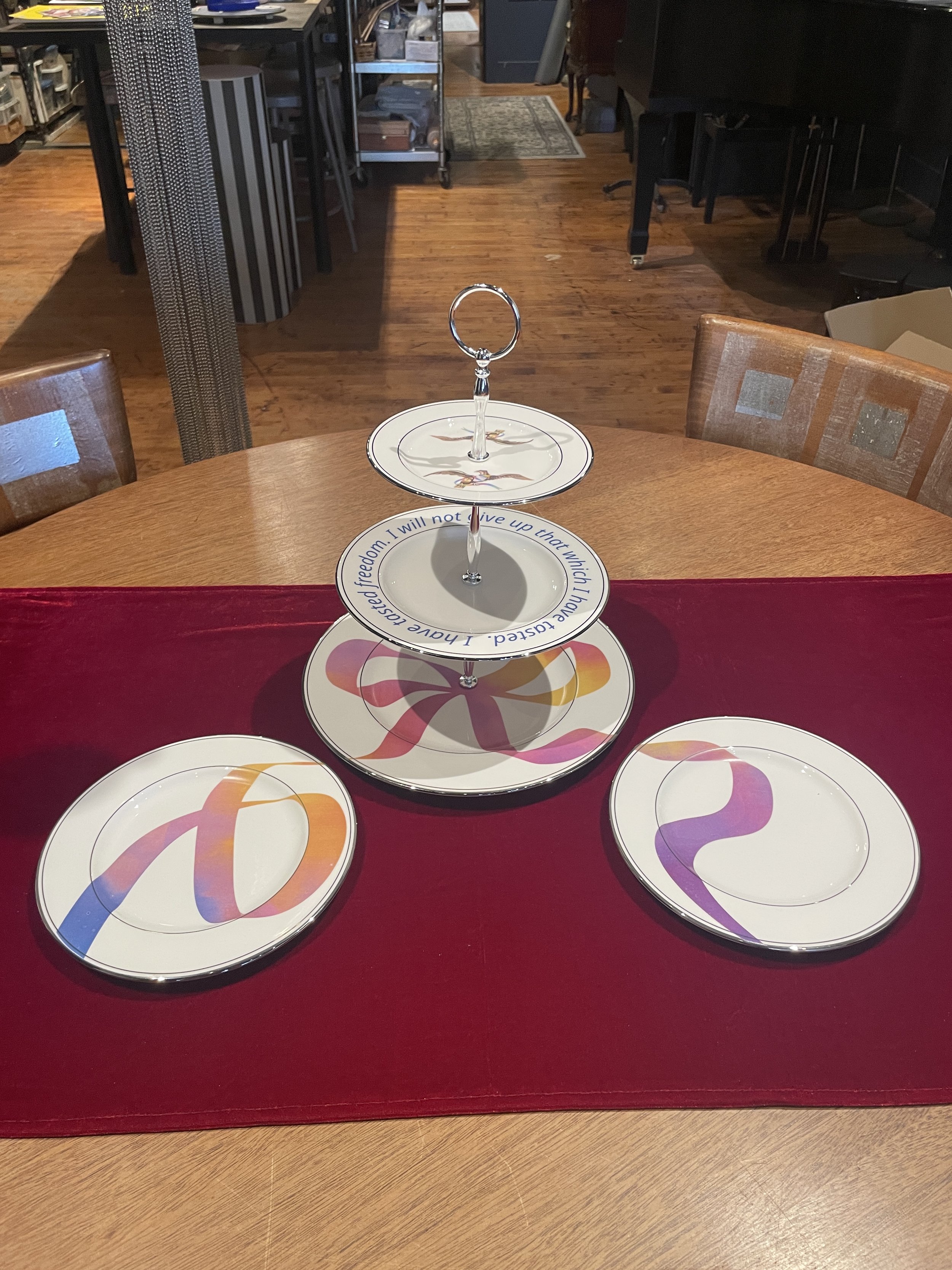 Queer owned and operated studio and gallery Biello Martin Studio also featured a duo exhibit with a tiered Lenox server. “Rainbow Ribbon” features an eagle design often used in Presidential China (originally a French Design), quote from Harvey Milk, and multicolor bow that connects to individual plates.